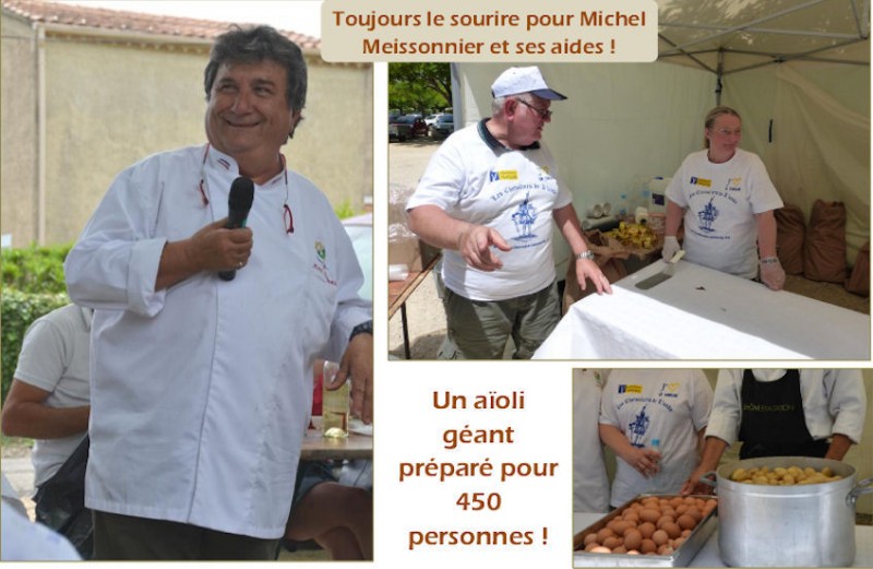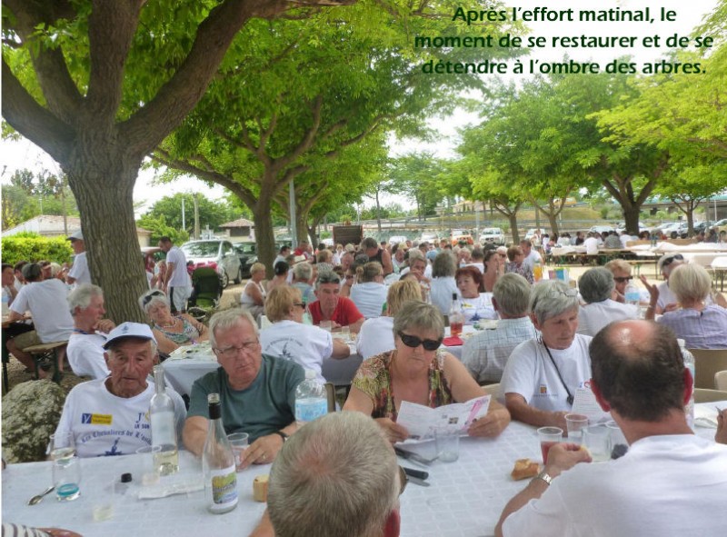 Puis le midi, 450 personnes parmi les "braves chevaliers" se sont réunies à l'ombre des arbres sur le parking de Velleron pour prendre le déjeuner préparé par notre Michel Meissonnier national, avec l'aide de nos épouses et des aide-cuisiniers de l'association.