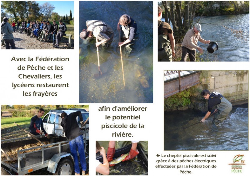 Dans le cadre d'un partenariat avec les lycées agricoles du secteur, notamment celui de Saint Rémy, nous sommes sur le terrain auprès des élèves qui viennent, encadrés de leur professeur. Entre les mois d'avril et de novembre, ils font régulièrement des sorties en bord de Sorgue, afin de s'exercer à débroussailer, tailler, reconnaître les plantes invasives, au Crillon et à Monclard. Ils participent également, avec la Fédération de Pêche et nous-mêmes, à la restauration des frayères au Crillon, à la maison de la pêche...