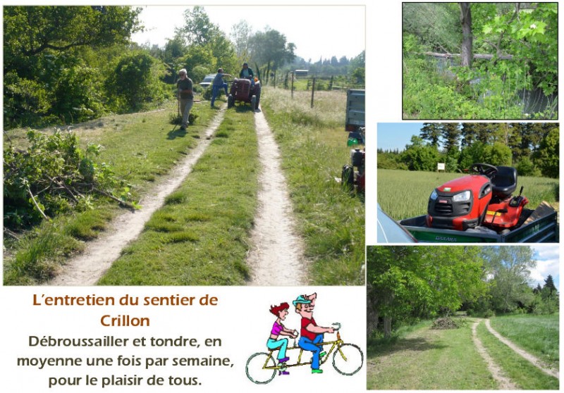 l'année, en moyenne un jour par semaine. Car il faut régulièrement débroussailler et tondre. Nous pouvons effectuer cet entretien grâce à l'aide de bénévoles et leur tracteur. Une famille de Velleron a fait cadeau à l'association d'une tondeuse autoportée. Un grand merci à toutes ces personnes.
