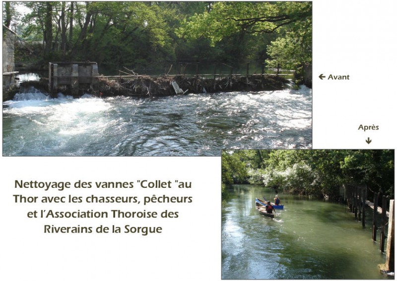 yage des berges. Certains secteurs sont particulièrement chargés car ils constituent la fin de parcours des débris végétaux et divers matériaux emportés par le courant. Ces embâcles, comme ici aux vannes Collet du Thor, peuvent faire monter le niveau du cours, et donc poser des problèmes lors des périodes de haut débit. La volonté et l'énergie constatées à chaque opération de nettoyage sont remarquables, mais ne suffisent pas : il faut aussi des engins