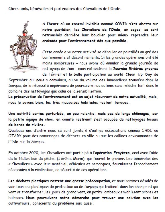 Nous retiendrons de cette année 2020 la forte mobilisation dans toutes les villes et villages traversés par la Sorgue.