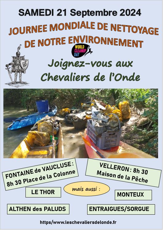 Ils participent à la Journée Mondiale de nettoyage de la planète le 21 Septembre et vous donnent rendez-cous en plusieurs endroits, notamment à Fontaine de Vaucluse et à Velleron.