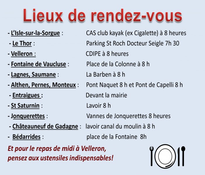 Après les différents repérages sur le terrain, des chantiers ont été établis, ainsi que les points de rendez-vous pour nos courageux bénévoles amoureux de la Sorgue.