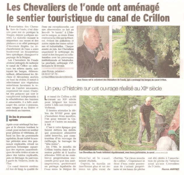 En ce début du mois de février, le "Dauphiné Libéré" vient de consacrer un article sur le sentier touristique du Canal de Crillon, aménagement entièrement conçu et réalisé par les Chevaliers de l'Onde, il y a maintenant 4 ans.
