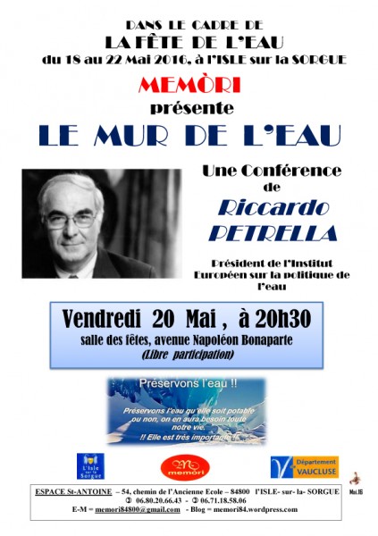 Parcours dans la ville, parcours dans d’autres pays, parcours vers l’avenir de notre planète, tels sont les chemins que cette première Fête de l’Eau vous invite à emprunter !" (extrait de la Newsletter d'avril 2016 Communauté de Communes Pays des Sorgues et Monts de Vaucluse"