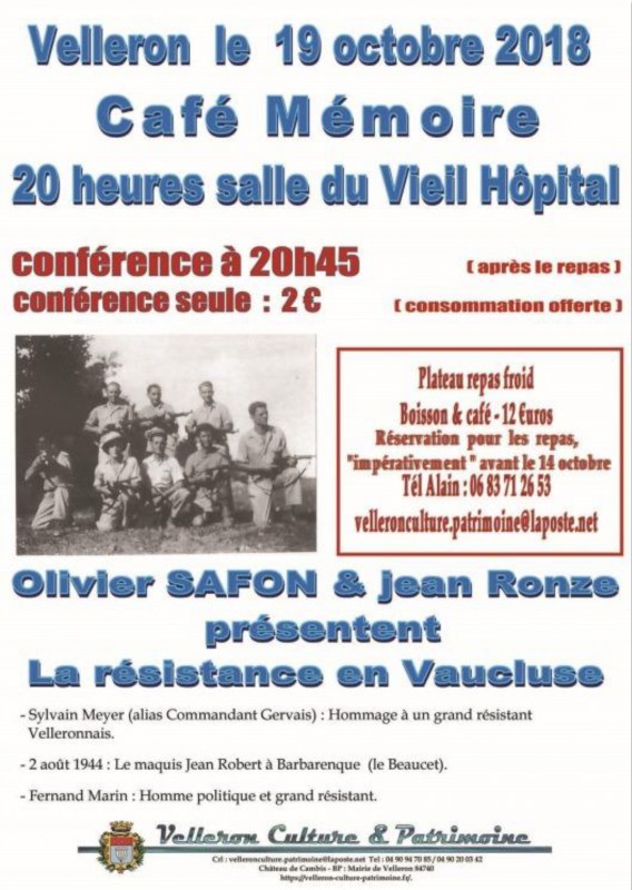 Un café Mémoire organisé par Velleron Culture & Patrimoine à 19 heures (plateau repas puis conférence. S'inscrire.